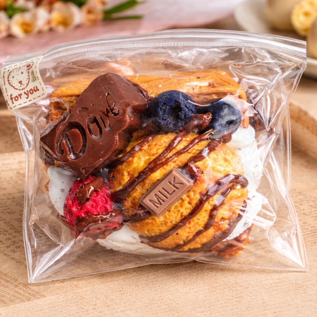 いちごやブルーベリーのトッピングがぎゅっと詰まって、まるで本物のスイーツみたいな贅沢デザイン!